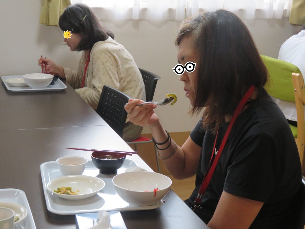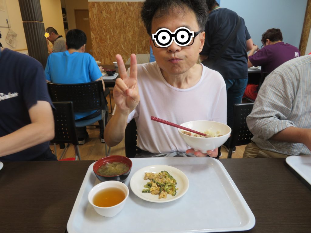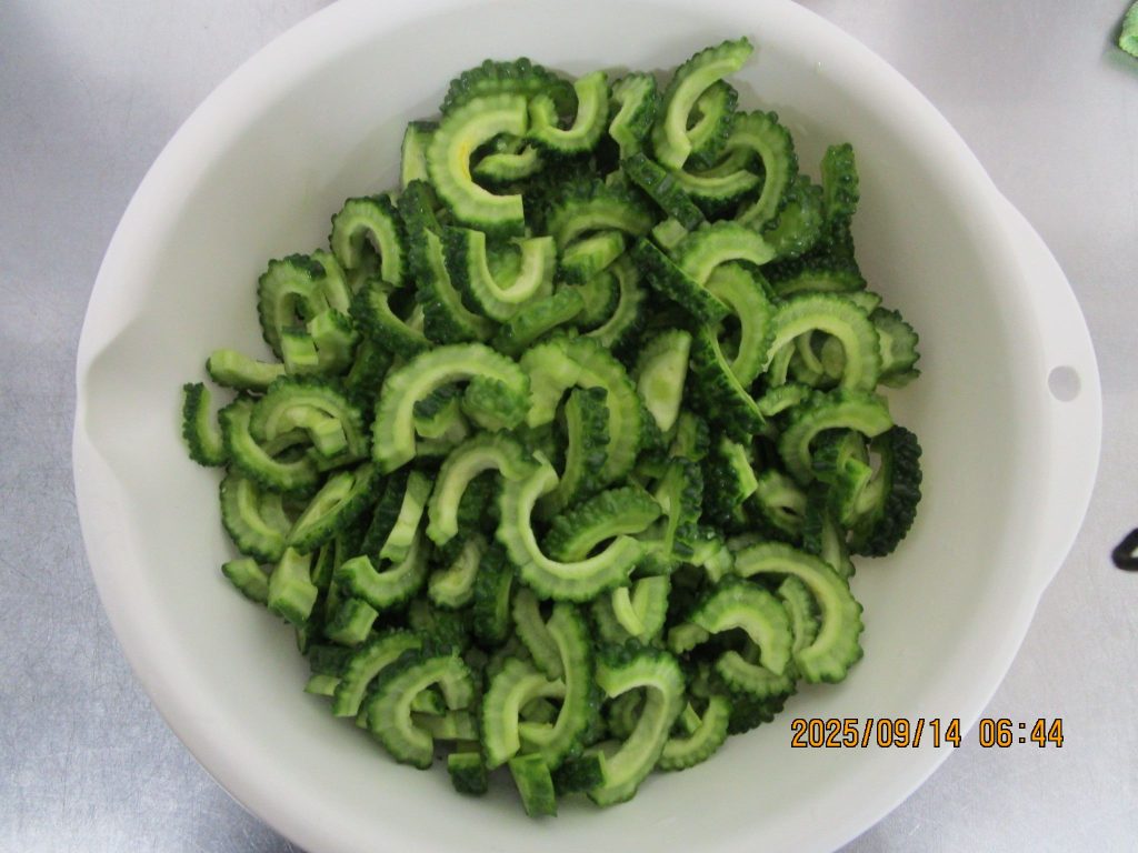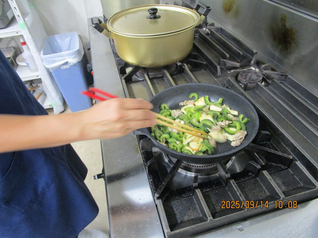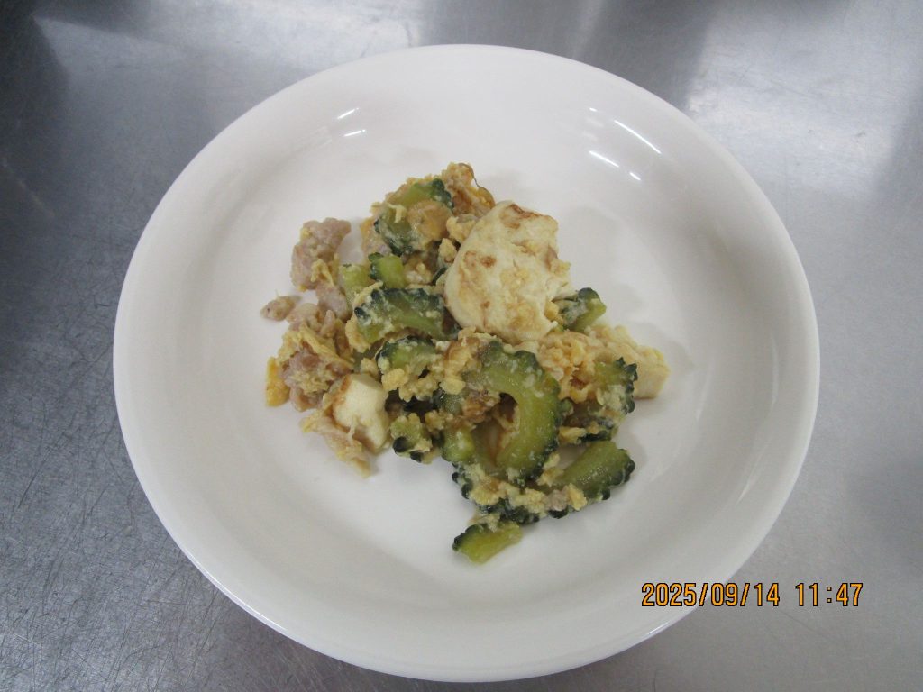 今回は実食編として、厨房職員に収穫したゴーヤを調理してもらい、昼食でゴーヤチャンプルーを出してもらいました。