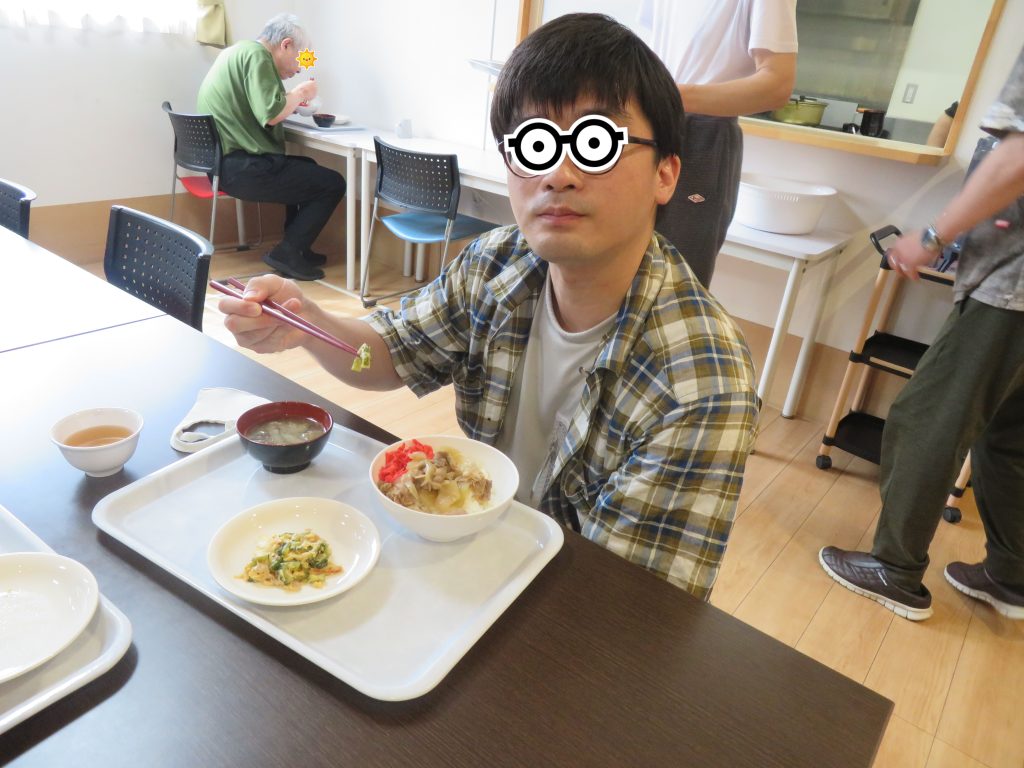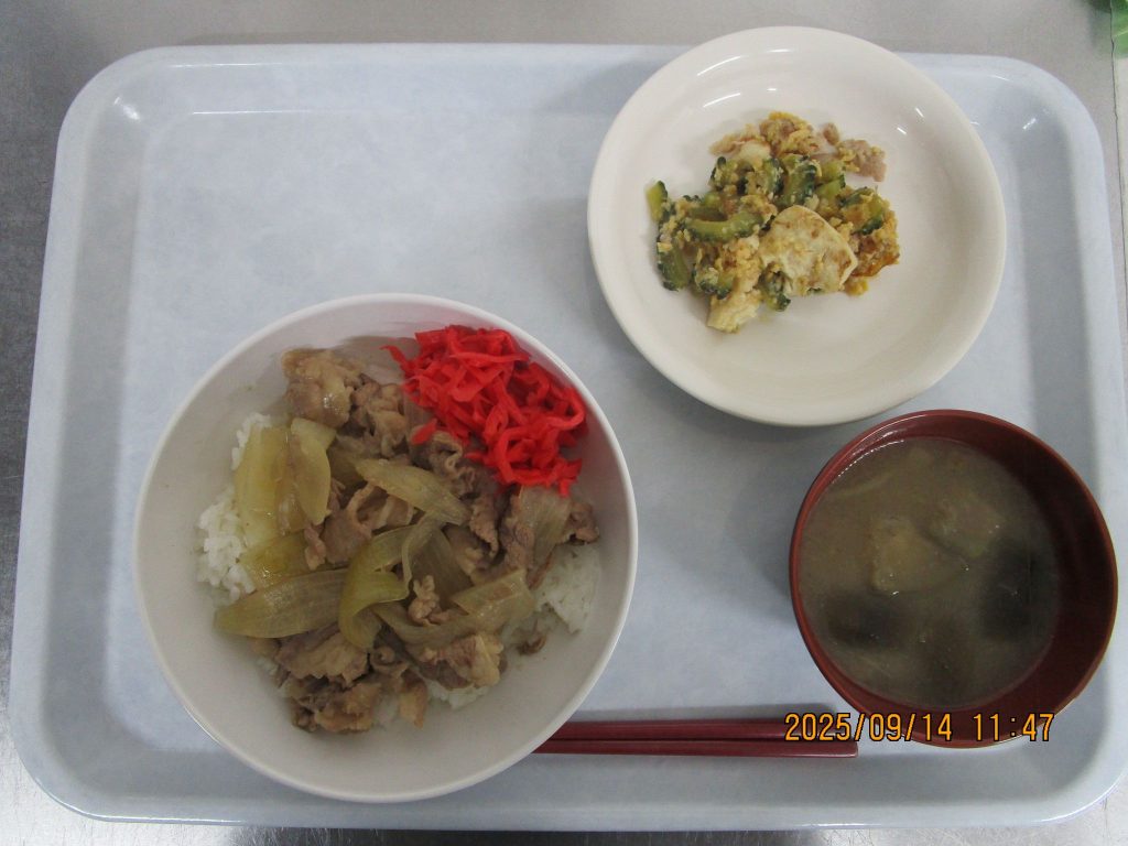 昼食はゴーヤチャンプルーに加えて、牛丼となすの味噌汁でした!