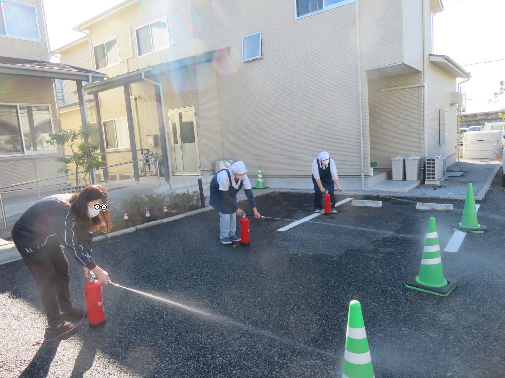 事業所に帰所した後は消防職員の方も参加しての消火器訓練を行いました。