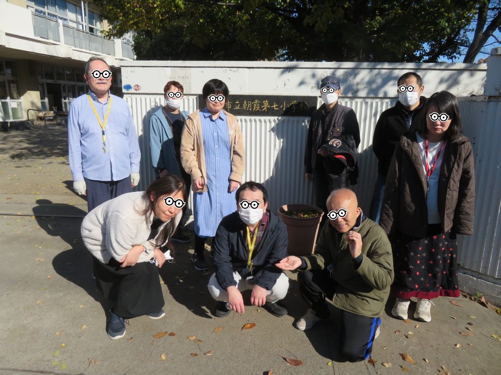 無事朝霞市立第七小学校に到着し、緊急避難場所であることも確認し、集合写真を撮りました。