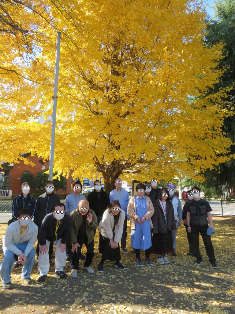 その後、北朝霞公園で「くれいん」の別の徒歩チームとも合流し、綺麗なイチョウの木の下で集合写真を撮りました。