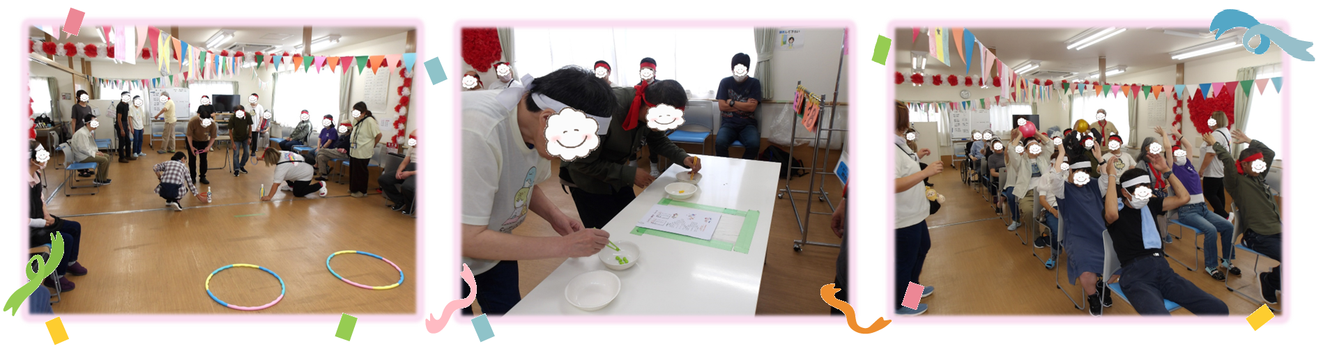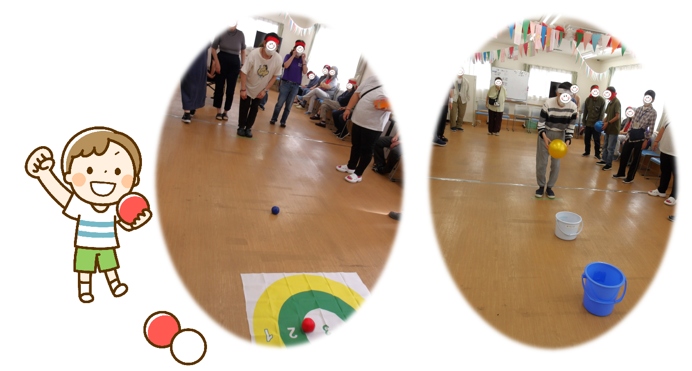 午前の競技は、①体内時計、②片足立ち競争、③ボッチャ、④バケツフリースロー、⑤サイコロ得点競争、⑥玉入れです!
