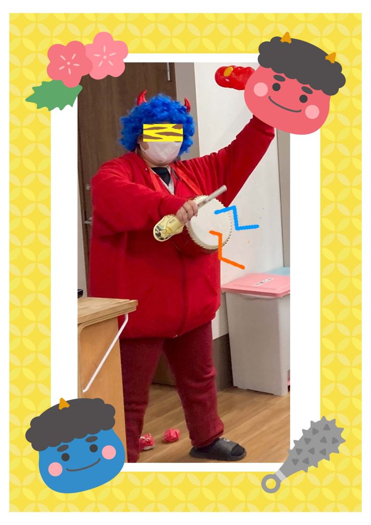 太鼓の音とともに、赤鬼・青鬼が一体化した怖い?面白い鬼に変身した職員が登場すると、利用者様から「わあ、鬼が来た!」と笑い声があがりました。