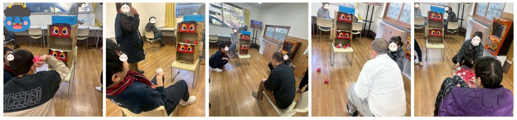 午前は豆まき。豆ではなく手持ちの玉を鬼に投げます。